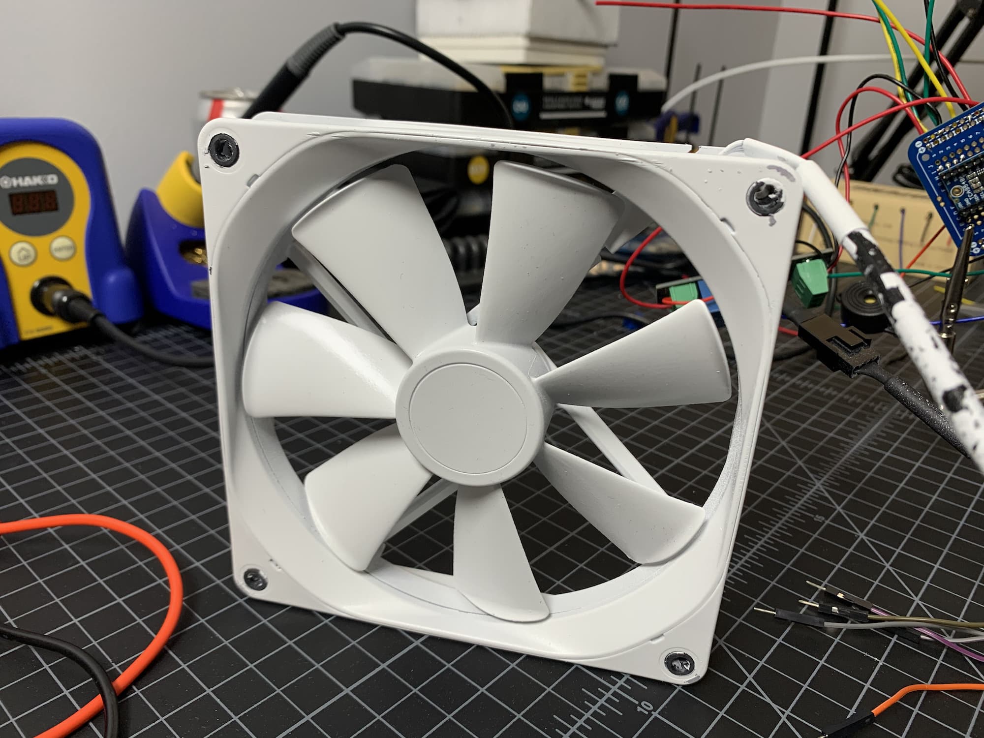 To control the fan's speed, I connected its PWM pin to a PWM pin on the Arduino. It took some math to change the Arduino's built-in PWM frequency to 25 kHz, but the slower fan speed significantly reduced noise.