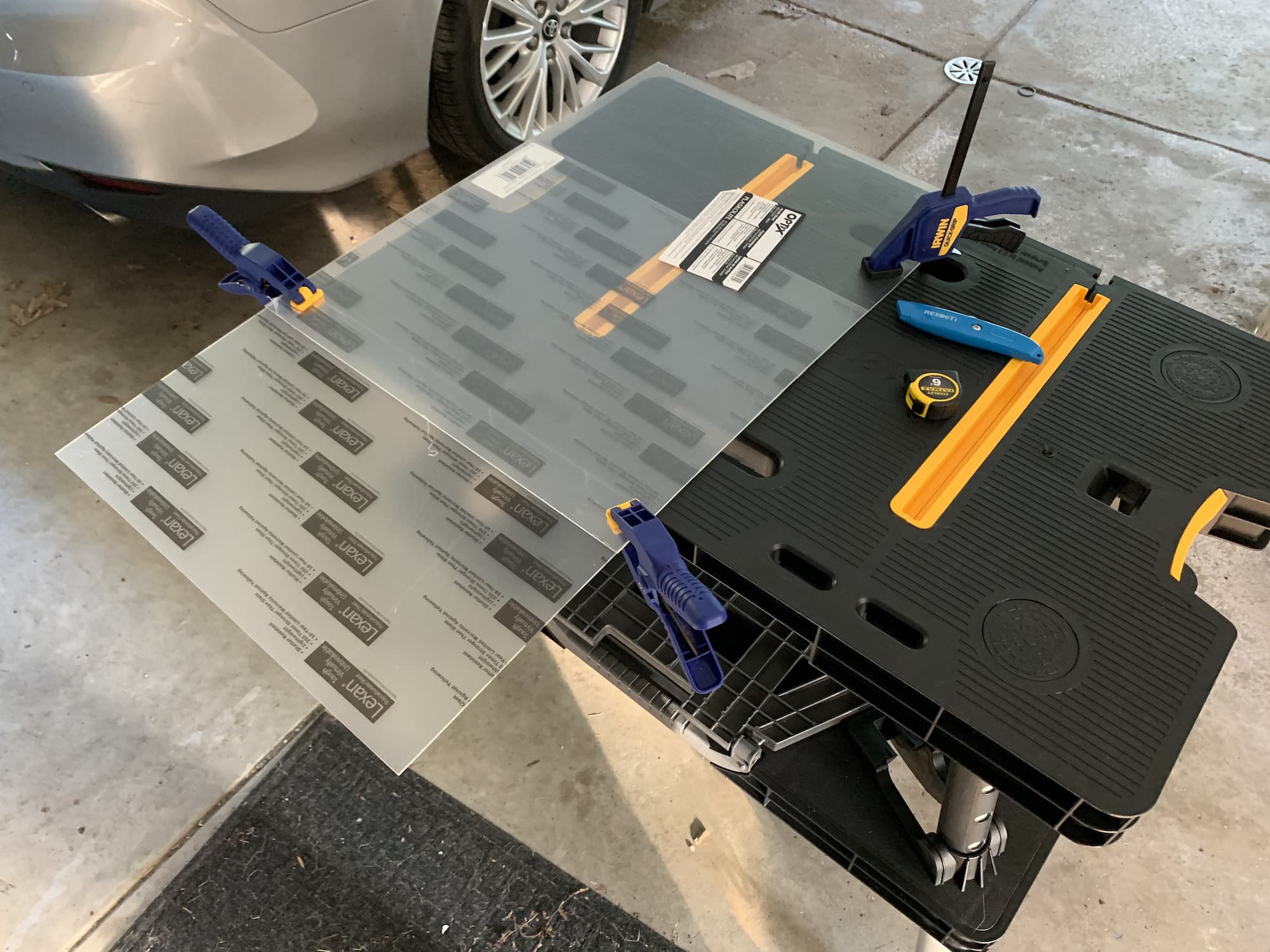 I bought some Lexan from Home Depot, scored the sheets with a box cutter, and snapped them off using the edge of my workbench. It worked surprisingly well.