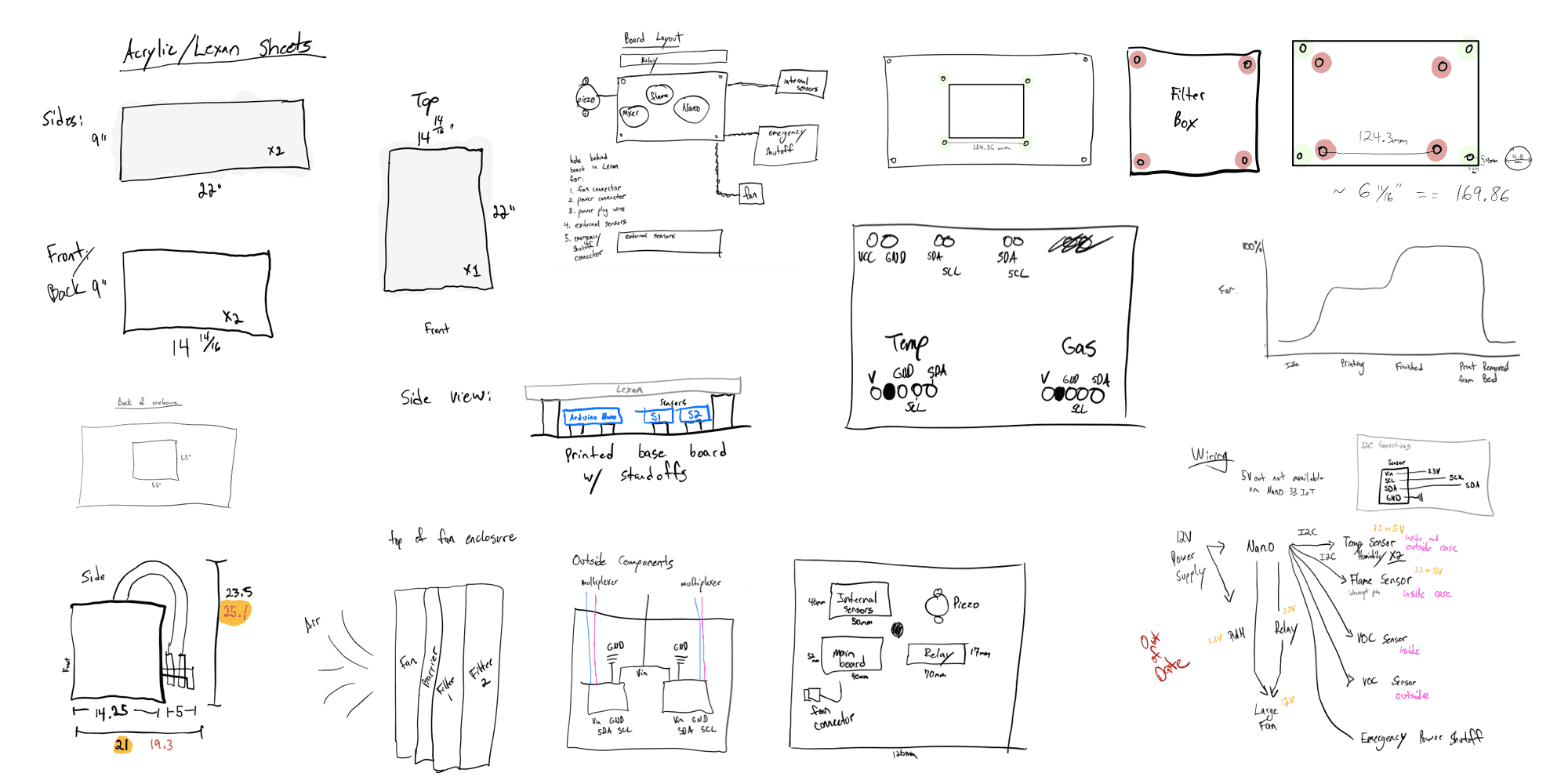 I'm a firm believer in "measure twice, cut once", so I started with a sketch of the system. I measured my 3D printer - an Ultimaker S3 - and jotted down a plan for the top enclosure. Then, I sketched out what components I wanted to use and how they'd connect.